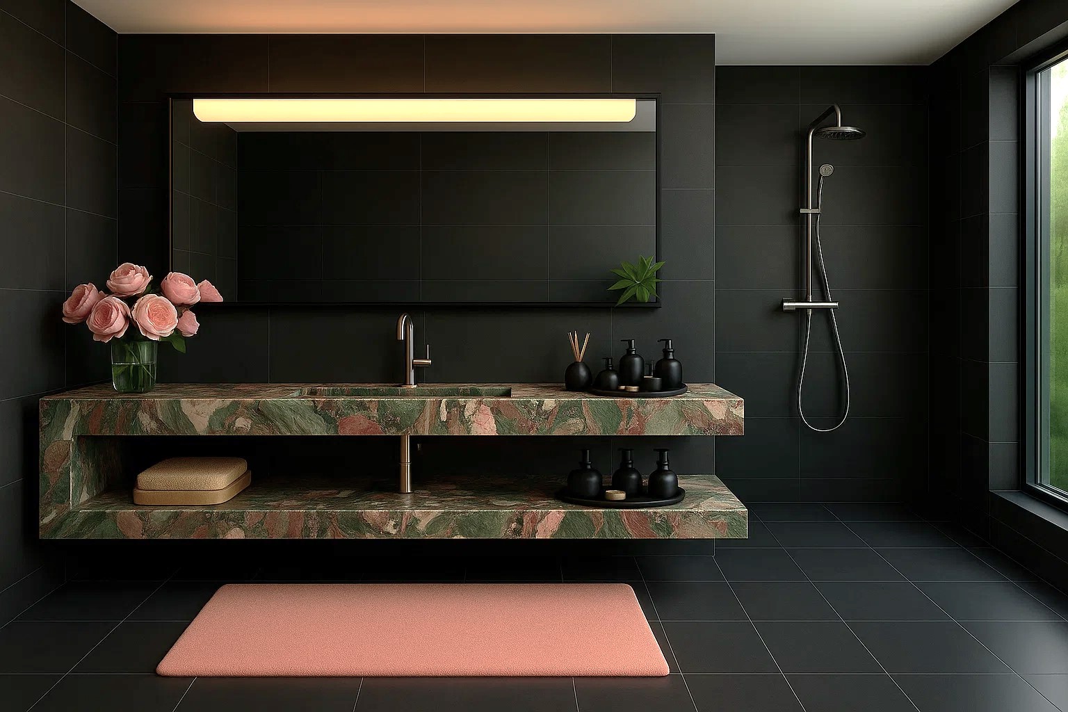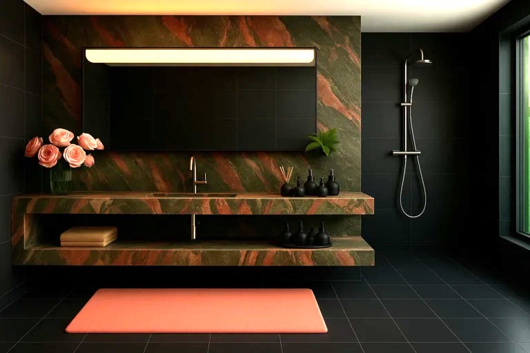 Das Badezimmer Ihrer Träume ist nicht nur eine schöne Waschtischplatte, sondern auch Wand- und Bodenverkleidungen aus großformatigen Keramikplatten oder Naturstein. Der Einsatz von großformatigen Keramikplatten sorgt dafür, dass das Bad nahezu fugenlos und sehr pflegeleicht ist. Besonders schön wirken die Keramikplatten im Bereich der Dusche und der Badewanne. In der Dusche plant man häufig Nischen oder kleine Ablagen für Kosmetikprodukte. Das gesamte Badezimmer sieht einfach fantastisch aus.