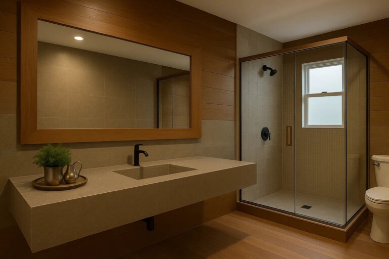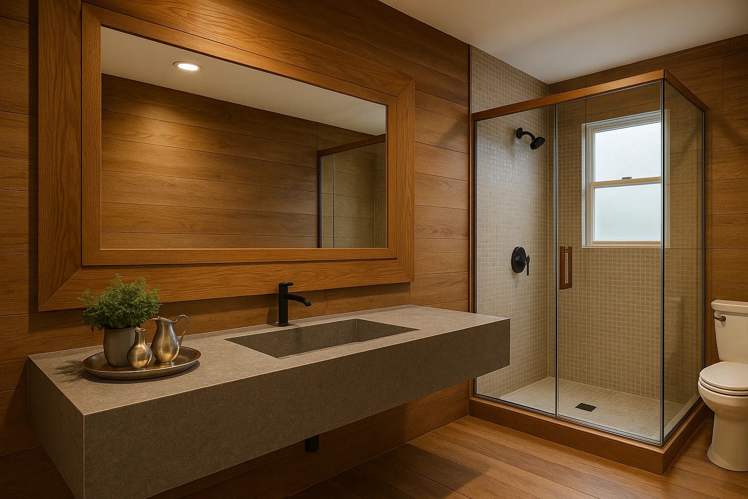 Das Badezimmer Ihrer Träume ist nicht nur eine schöne Waschtischplatte, sondern auch Wand- und Bodenverkleidungen aus großformatigen Keramikplatten oder Naturstein. Der Einsatz von großformatigen Keramikplatten sorgt dafür, dass das Bad nahezu fugenlos und sehr pflegeleicht ist. Besonders schön wirken die Keramikplatten im Bereich der Dusche und der Badewanne. In der Dusche plant man häufig Nischen oder kleine Ablagen für Kosmetikprodukte. Das gesamte Badezimmer sieht einfach fantastisch aus.