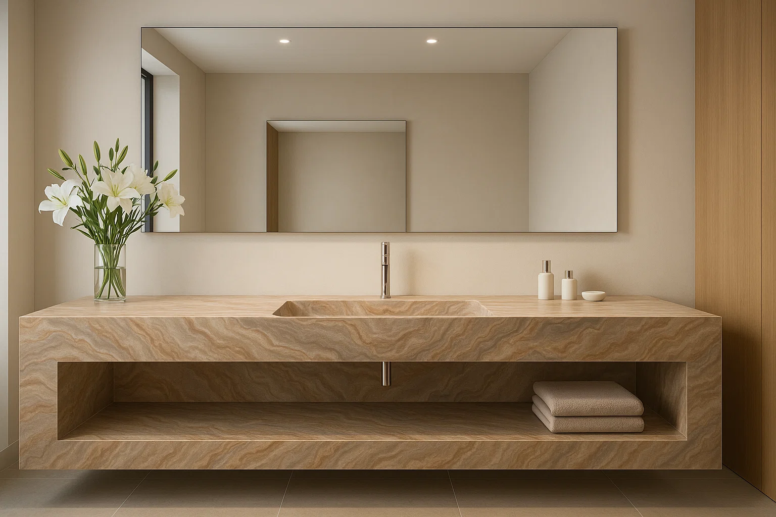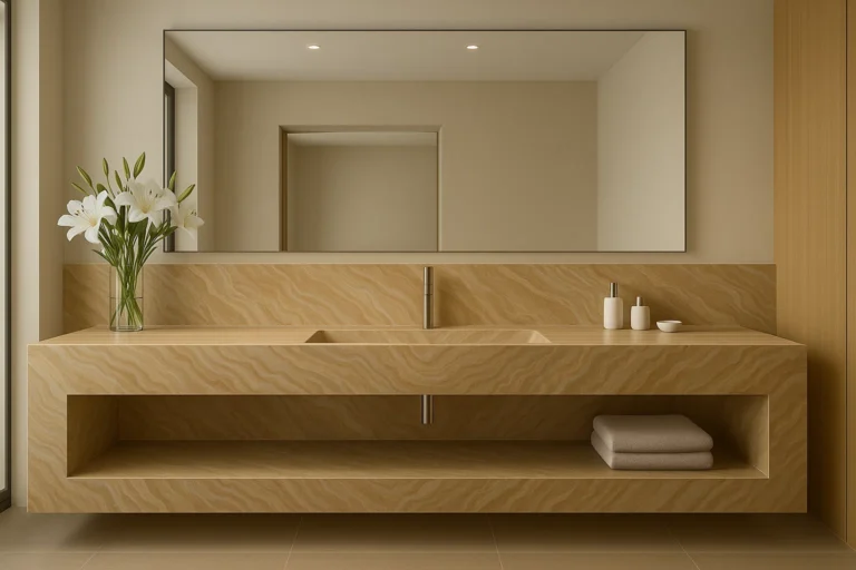 Wir bieten einen einzigartigen Waschtisch mit integriertem Waschbecken – Franko – gefertigt aus hochwertigen Franko-Keramikplatten (Feinsteinzeug) oder Naturstein. Jedes Stück wird individuell nach Ihren Wünschen und den benötigten Maßen gefertigt. Mit unserer Waschtischplatte Franko verleihen Sie Ihrem Badezimmer eine moderne, stilvolle und außergewöhnliche Note.
