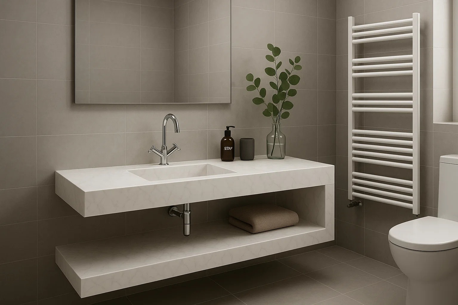 Wir bieten einen einzigartigen Waschtisch mit integriertem Waschbecken – Franko – gefertigt aus hochwertigen Franko-Keramikplatten (Feinsteinzeug) oder Naturstein. Jedes Stück wird individuell nach Ihren Wünschen und den benötigten Maßen gefertigt. Mit unserer Waschtischplatte Franko verleihen Sie Ihrem Badezimmer eine moderne, stilvolle und außergewöhnliche Note.