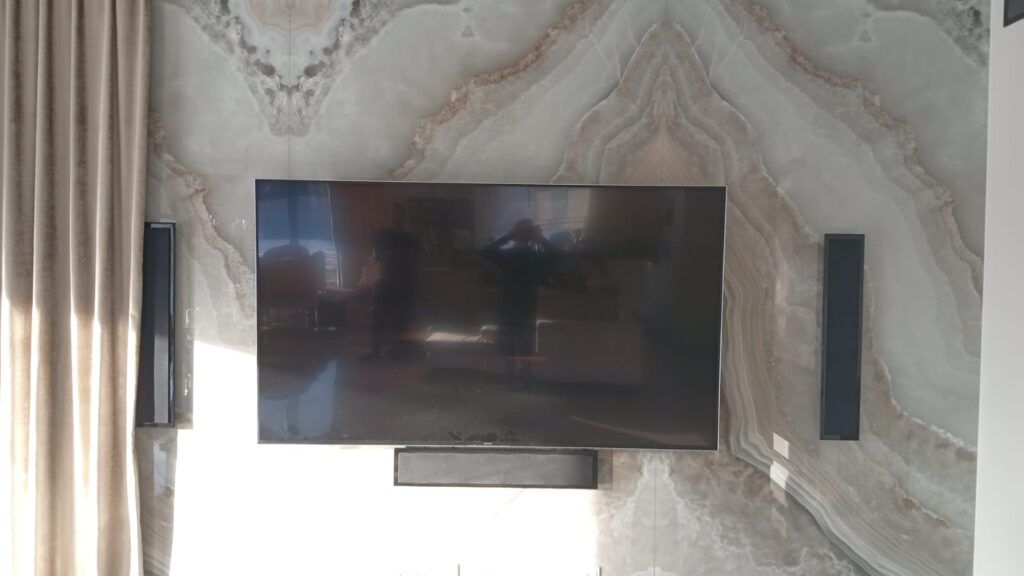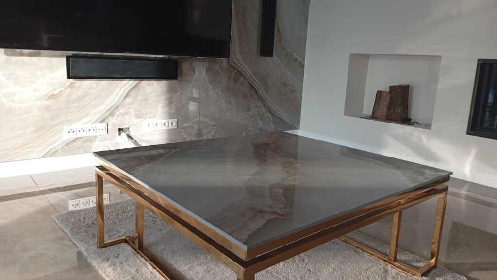 Bei unserem Kunden haben wir exklusive Wandverkleidungen aus Keramik im Wohnzimmer installiert. Das verwendete Material, Franko Onice Chanel, zeichnet sich durch eine elegante Maserung und einen dezenten Glanz aus, der dem Raum eine besondere Atmosphäre verleiht. Durch die präzise Anpassung der Platten und die sorgfältige Ausführung aller Details entstand ein harmonisches und modernes Endergebnis.