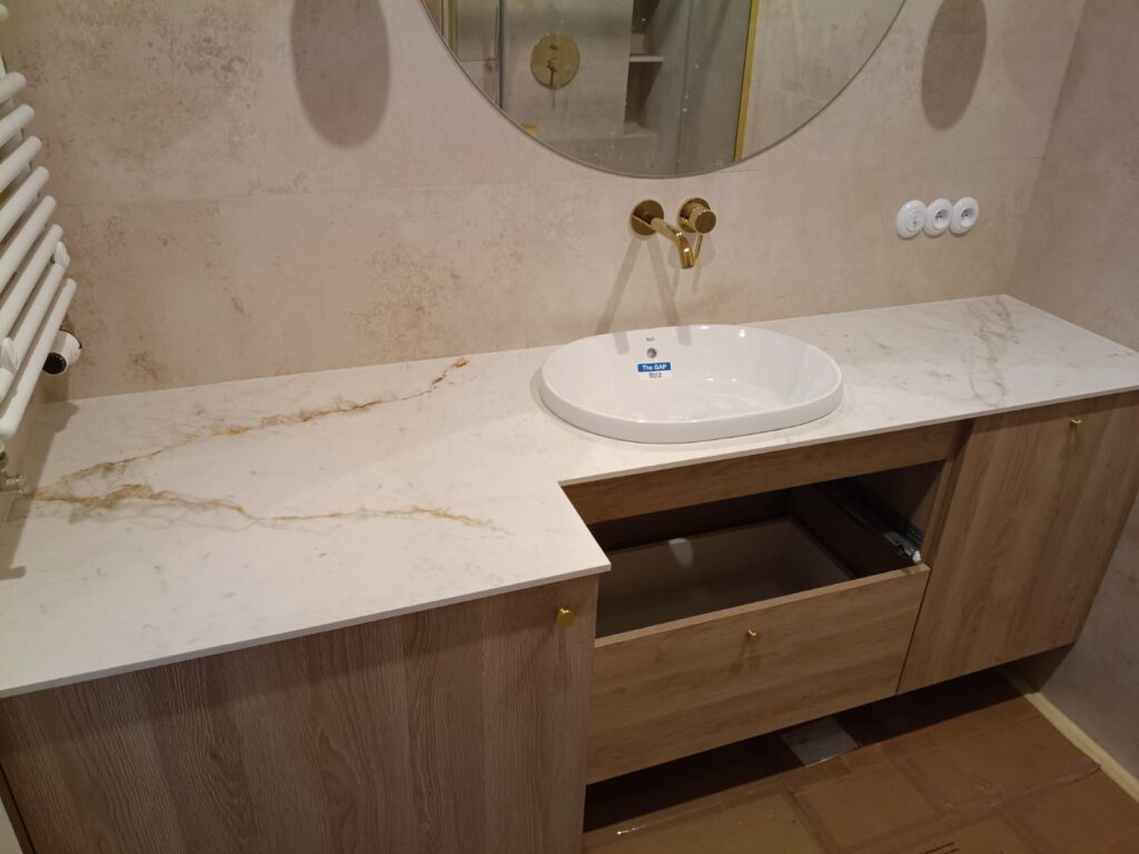 Bei unserem Kunden haben wir eine Realisierung mit der Montage von Waschtischplatten aus Keramik Franko White Gold ausgeführt. Die elegante Oberfläche in Weiß mit goldenen Akzenten verleiht dem Badezimmer einen zeitlosen Charakter und betont dessen exklusiven und modernen Stil. Durch die präzise Montage und sorgfältige Detailanpassung wird höchste Qualität in Bezug auf Langlebigkeit, Funktionalität und Ästhetik gewährleistet.
