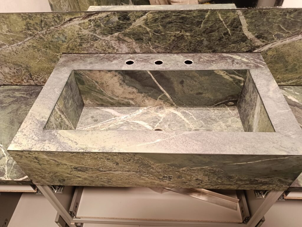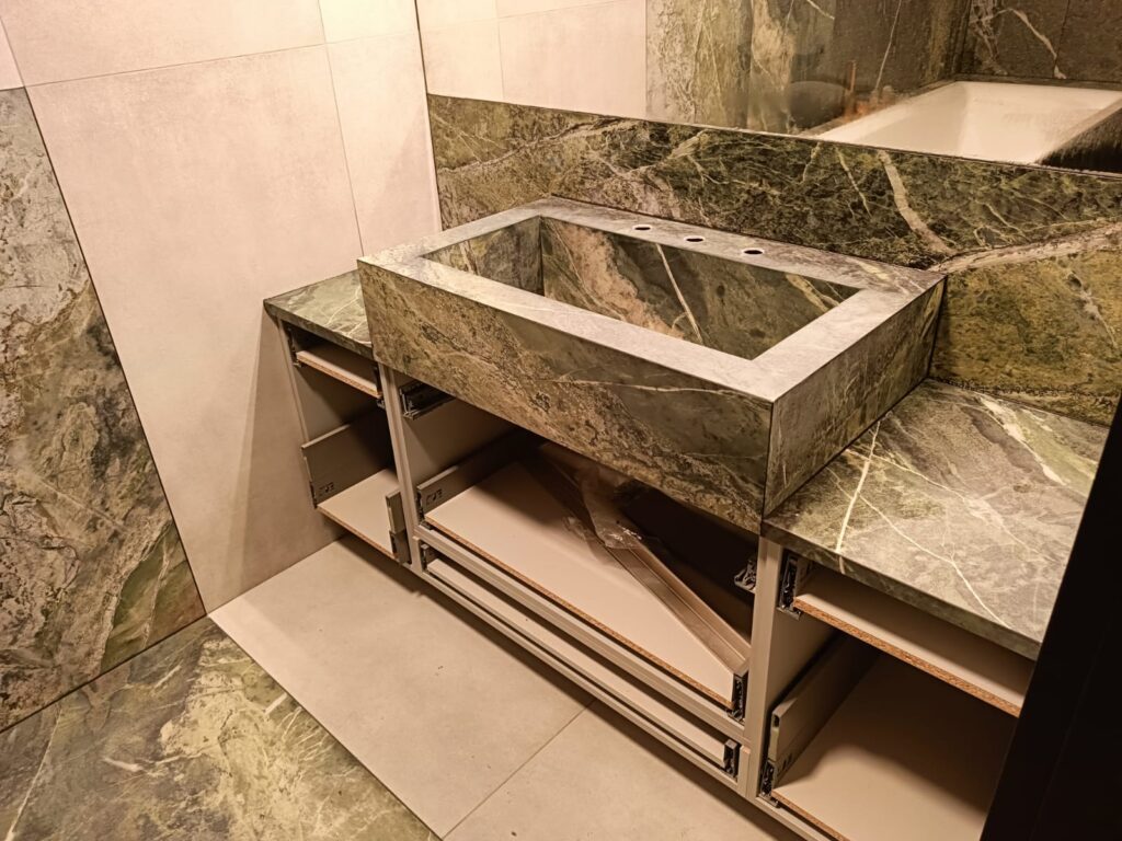 Bei unserem Kunden haben wir elegante Waschtischplatten aus Neolith Amazonico installiert. Dieses außergewöhnliche Material besticht durch seine naturinspirierte Maserung sowie seine hohe Beständigkeit gegen Feuchtigkeit, Kratzer und chemische Einflüsse. Das Endergebnis verbindet modernes Design mit Langlebigkeit und einer luxuriösen Ausstrahlung – eine perfekte Ergänzung für ein stilvolles Badezimmer.